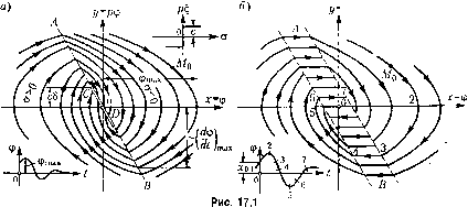 Главная -> Повышение запаса устойчивости Система с пере.мениой структурой. Как уже ука.зывалось в главе 2 системы с перемеииой структурой! содержат в себе специальное переключающее устройство для нз.мепе1Н[я у((рав-ляющего устройства, которое срабатывает в зависи.мости от размеров и знаков входных величин. При.мер иереключаюптего устройства приведен схематически па рис. 16.27, где КЭ - ключевой элемент, БИС - блок изменеиня структуры. Его уравпепис [32] принято за[1исывать в виде i----- -*{бис Рис. 16.27 и = Ц1Х. (16.70) Функция \/ может строиться по-разно.му Например, а при .r,x>0, Р при .rj.r<0. (16.71) Основная характерная нелинейность .здесь состоит в самом факте автоматически го переключения в зависимости от состояния входных величи[т Глава 17 ТОЧНЫЕ МЕТОДЫ ИССЛЕДОВАНИЯ УСТОЙЧИВОСТИ И АВТОКОЛЕБАНИЙ § 17.1. Фазовые траектории и метод точечных преобразований Понятие о фа.зово.м пространстве, о фазовых траекториях и их типах было уже дано вьнпе. В данном параграфе па примерах построения фазовых траекторий для простейших систем второго порядка будут проиллюстрированы некоторые важные особенности процессов в нелинейных системах автоматического управления. П р и .м е р 1. Возь.мем cncre.vfy авто.матического управления с объектом без са-мовыравпивапия и с приводом управляющего органа, имеющи.м постоянную скорость. Уравнение объекта будег 7 РФ = (17.1) Для управляюпдего устройства без массы и демпфера с жесткой обратной связью, т. е. при 5г1 = -ф, а = л - С, С получим 1 S (17.2) где ф, г], , С и а - относительные изменения управляе.мой величины, смещений чувствительного элемента, управляюп1его органа, элемента обратной связи и управляющего золотника (рис. 10.11, а), 6 - коэффициент. Пусть привод управляющего органа и.меет постоянную скорость в двух вариа]1тах; 1) с мгновенным переключением (рис. 16.22, ж) при переходе управляющего элемента (золотника, струйной трубки) через нейтральное положение (о = 0); 2) с зоной нечувствительности (рис. 16.22, з) вследствие наличия перекрытия золотника или струйной трубки. В первом случае уравпение привода управляющего органа будет р = с sign о. а во втором = О при \ а\<Ь, p = csigna прна>й. Возьмем фазовую плоскость (х,у), притшв х=ф, ,г/=рф. Из уравнений (17.1), (17.2) и (17.5) имеем (17.3) (17.4) (17.5) (17.6) Следовательно, переключения привода в нервом варианте (о = 0) будут иметь место при х=-ЪТ у, (17.7) что соответствует прямой АВ (рис. 17.1, а) па фазовой плоскости, причем согласно (17.6) значениям а > О соответствует часть плоскости слева от прямой АВ, а о < О - стфава. На осповапии первого из соотношений (17.6) с учетом (17.3) прн а< О получаем dy с а из (17.5) (17.8) откуда находим уравнения фазовых траекторий dy с dx Т у (17.10) или, после интегрирования. Это есть семейство парабол, показанное па рис, 17.1, а справа от линии АВ (они си.мметричны относительно оси х). Так как (17.8) и (17,9) являются проекния.ми скорости V изображающей точки М на оси х и у, то имеем Vy < О, а знак 1)д. совпадает со знаком г/. В соответствии с этим па рис. 17.1, укажем стрелочками направление движения изображаюп1ей точки М по фа.зовым траекториям. Аналогичным путе.м легко строятся параболы слева от прямой АВ. В результате, как видно из обпюго расположения фазовых траекторий (рис. 17,1, а), получается устойчивая система с затухающи.м колебательным переходным процессом. Но чисю колебаний будет конечны.м. В самом деле, здесь и.меется особый отрезок CD, в который вливаются все фазо