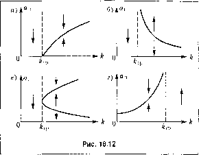 ![]() воеть при малых оттстопениях от исследуемого колебательного режима, что выше и делалось. Практически лее из анализа полученных приближенных уравнений пелипейпой системы часто можно делать значительно более широкие выводы. В частности, можно оценивать устойчивость системы в тех областях ее параметров, в которых периодические решения отсу гствуют вовсе. Пусть, например, определено, что периодическое решение, амплитуда которого показана па рис. 18..5, а, устойчиво (оно соответствует автоколебания.м). Условимся факт устойчивости периодического решения обозначать па графике вертикальными стрелками, сходянптмися к данному периодическому реп1епию (рис. 18.12, а). Этим обозначением иллюстрируется то, что переходные процессы с обеих сторон (г. е. с больпнт.ми, чем а , и с меньпшми, че.м а , начальными амилитуда\п1) сходятся к автоколебательно.му процессу с амплитудой а . Пусть в данном случае к обозначает коэффициент передачи линейгюй части. График рис. 18.12, а показывает, что в системе возникают автоколебания при к > к.. Естественно сделать отсюда вывод о том, что в области О < Л < .р (где нет периодического ренгения) данная система будет устойчива, что также обозначено на рис. 18.12, а вертикальной стрелкой. Апачогичное заключение для области О < й < .р .можно сделать и в случае неустойчивого периодического репюния па рис. 18.12, б, и в случае па.;и1чия двух периодических решепий на рис. 18.12, о, одно из которых устойчиво, другое неустойчиво. Если же автоколебания наблюдаются в области О < к < к., как показано па рис. 18.12, г, то естественно предио.чожить, что область к > к.. будет областью неустойчивости данной нелинейной системы. Наконец, если периодических решепий для исследуемой нелинейной систе.мы ffc получается вовсе ни при каких згшчепиях ее параметров, то согласно гео.метрическому способу определения автоколебаний (см. выше) получим, что кривая Михайлова будет либо охватывать начало координат при всяком значении а, либо ие охватывать его ири всех а. Отсюда можно сделать вывод, что в перво.м случае данная нелинейная система устойчива, а во втором - неустойчива. Развитие, а также сравнение да1шого способа определения устойчивости равновесия не.тинейиой системы с методом Ляпунова, показьшаюшее эффективность такого способа, см. в книге [72, §§ 2.7-2.9]. § 18.3. Примеры исследования нелинейных систем первого класса Рассмотрим несколько примеров применения изложенного в предыдущем параграфе метода. П р и .м е р 1. Найдем влияние ограничения лиггсйной характеристики двигателя (рис. 18.13, а) па процессы в следящей систе.ме. Пусть остальные звенья системы ли-пейр1ы. Тогда уравнение управляемого объекта с двигателем вместо (16.63) примет вид (r p+l)pP-cf(U, \j\eF{i) определяется графико.м рис. 18.13, а. Применяя к правой части этого уравнения формулы гармонической линеаризации (18.22) с заменой с = 6 получаем уравнение управляемого объекта с двигателем в виде (г /;+1)рР = ./( )/ , q = k, =ck. . b b arcsm -+ - . a a\ при a < b, при a>b. (18.65) (18.66) что изображено графически на рис. 18.13, б. Здесь а обозначает амплитуду колебаний величины zj,. Общее уравнение остальной части следящей системы согласно (16.53) будет (Г,р+ l)i, = -f+ (/>+ 1)0/IP- (18.67) На основании (18.65) и (18.66) 1голучаем характеристическое уравнение (Г р + 1) (Г р +\)p + q {а) [к + (Г я + \)к,р\ = 0. (18.68) После приведения его левой части к виду flgp + ajp -t aj) + a.-j и подстановки p =j(X) получаем уравнения типа (18.36) в 